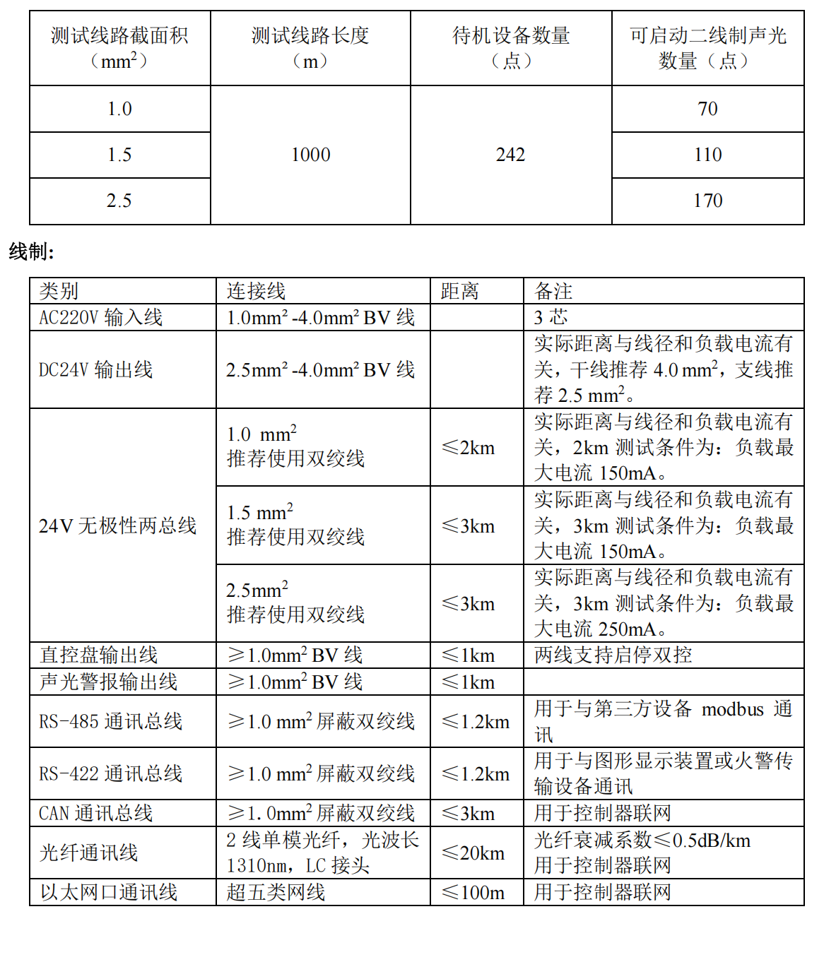 下表給出不同線徑條件下 1 個回路可配接的二線制聲光警報器數(shù)量作為參考。
